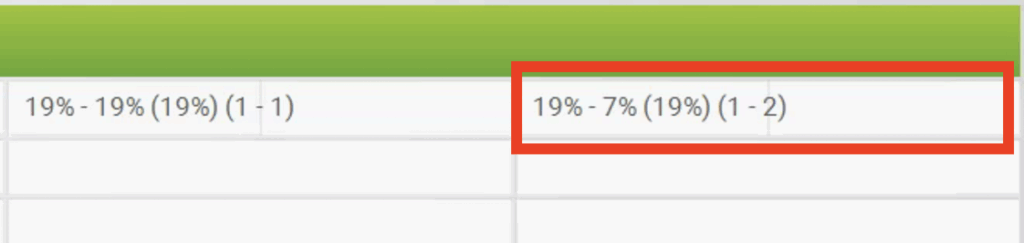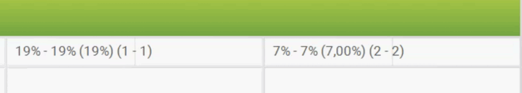 Aktuell sollten die MWST wie im Bild vorfinden. Die Einstellung für den Steuersatz 19% – 7% muss geändert werden.
