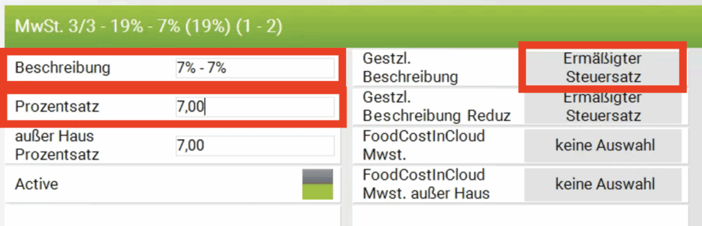 Die „Gesetzl. Beschreibung Reduziert“ verbleibt bei „Ermäßigter Steuersatz“ (diese Angaben sind wichtig für den korrekten Betrieb der TSE und müssen unbedingt angepasst werden)
