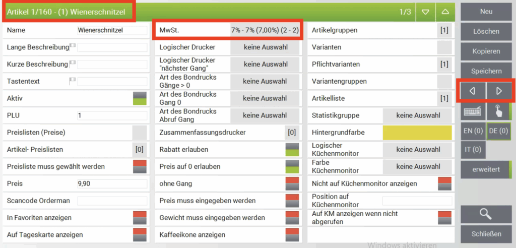 Bei dem Punkt MwSt. ist je Artikel zu überprüfen ob der korrekte Satz eingestellt ist.